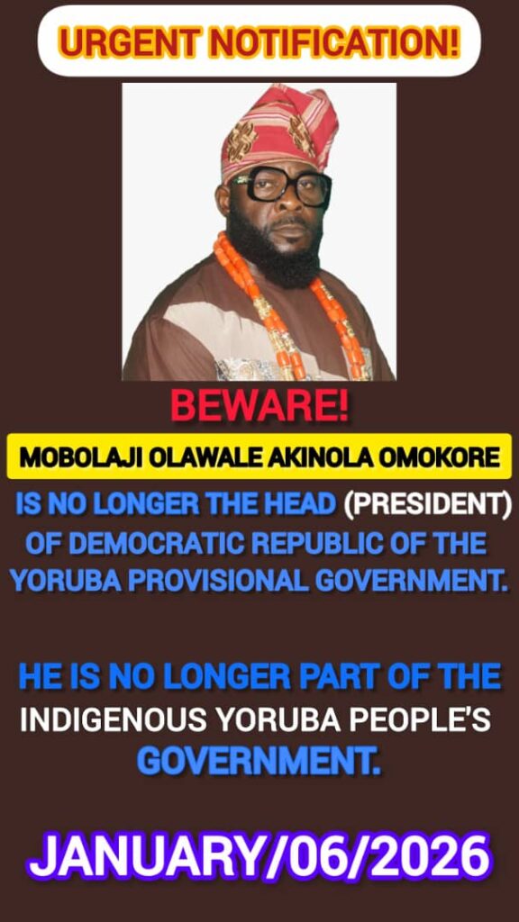 Democratic Republic of the Yoruba (D.R.Y) Sovereignty was Proclaimed on Friday, 12th of April, 2024, by the Mother of the Indigenous Yoruba People (I.Y.P) of Democratic Republic of the Yoruba (D.R.Y), Mama Modupe Onitiri-Abiola (Chief Mrs). This was after the D.R.Y had previously declared its Independence on 20th of November, 2022. Immediately after the Proclamation of Sovereignty on 12th of April, 2024, the same day the Swearing-In of the Head of Provisional Government, His Excellency Mobolaji Olawale Akinola Omokore, took place. On that day, Democratic Republic of the Yoruba (D.R.Y) thus activated its sovereignty and became the newest sovereign nation in the world, 55th in Africa and 17th in West Africa.
