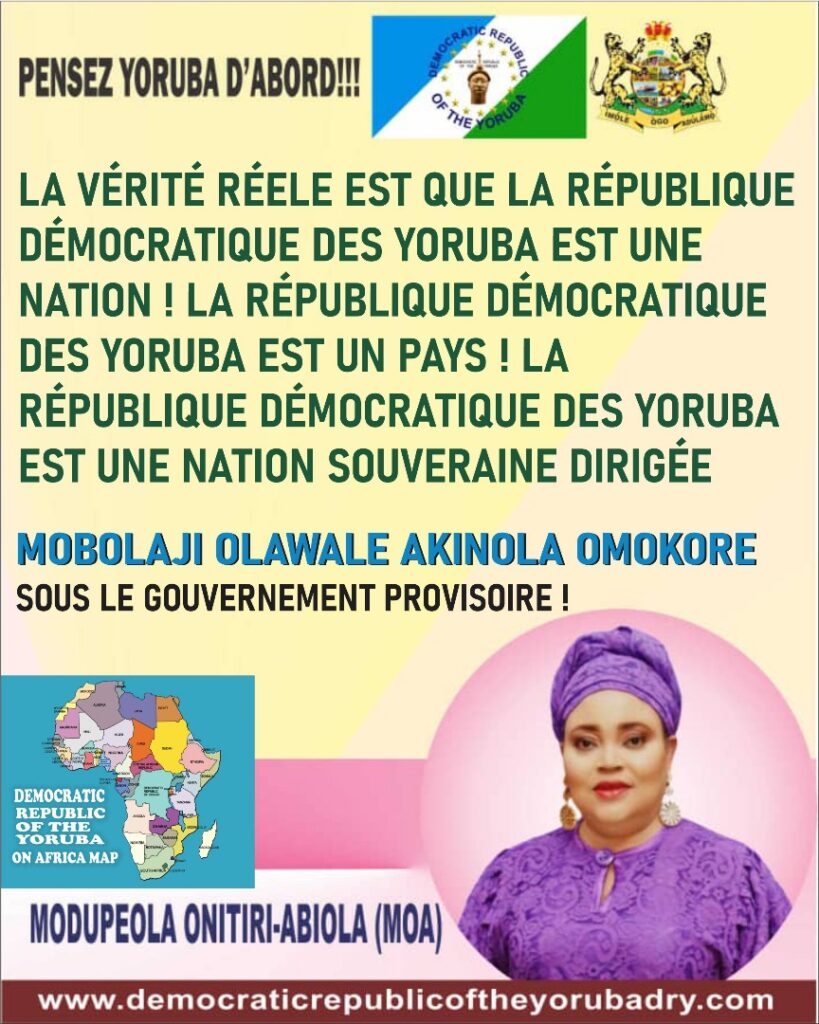 LA VÉRITÉ RÉELE EST QUE LA RÉPUBLIQUE DÉMOCRATIQUE DES YORUBA EST UNE NATION ! LA RÉPUBLIQUE DÉMOCRATIQUE DES YORUBA EST UN PAYS ! LA RÉPUBLIQUE DÉMOCRATIQUE DES YORUBA EST UNE NATION SOUVERAINE DIRIGÉE MOBOLAJI OLAWALE AKINOLA OMOKORE SOUS LE GOUVERNEMENT PROVISOIRE !